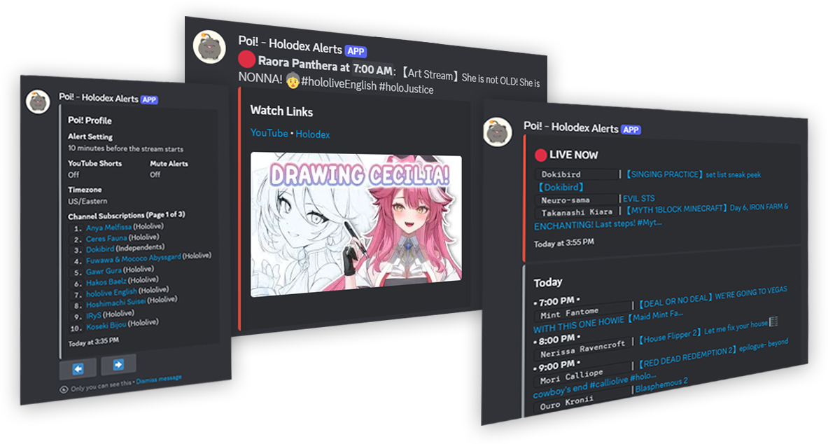 Poi! is a fan-made Discord bot that can DM you when your favorite vtubers on Holodex.net are about to go live and can also show you a personalized stream schedule.